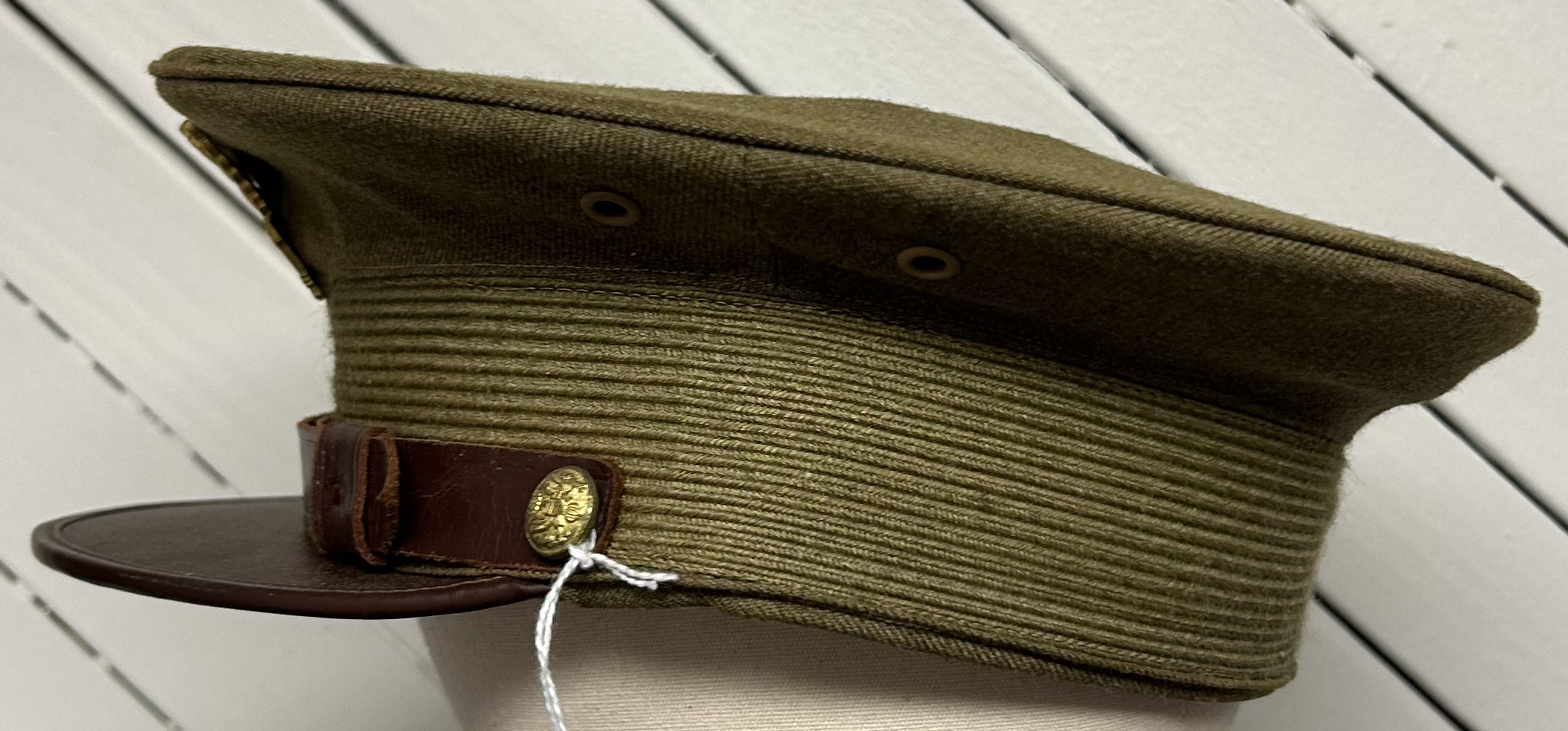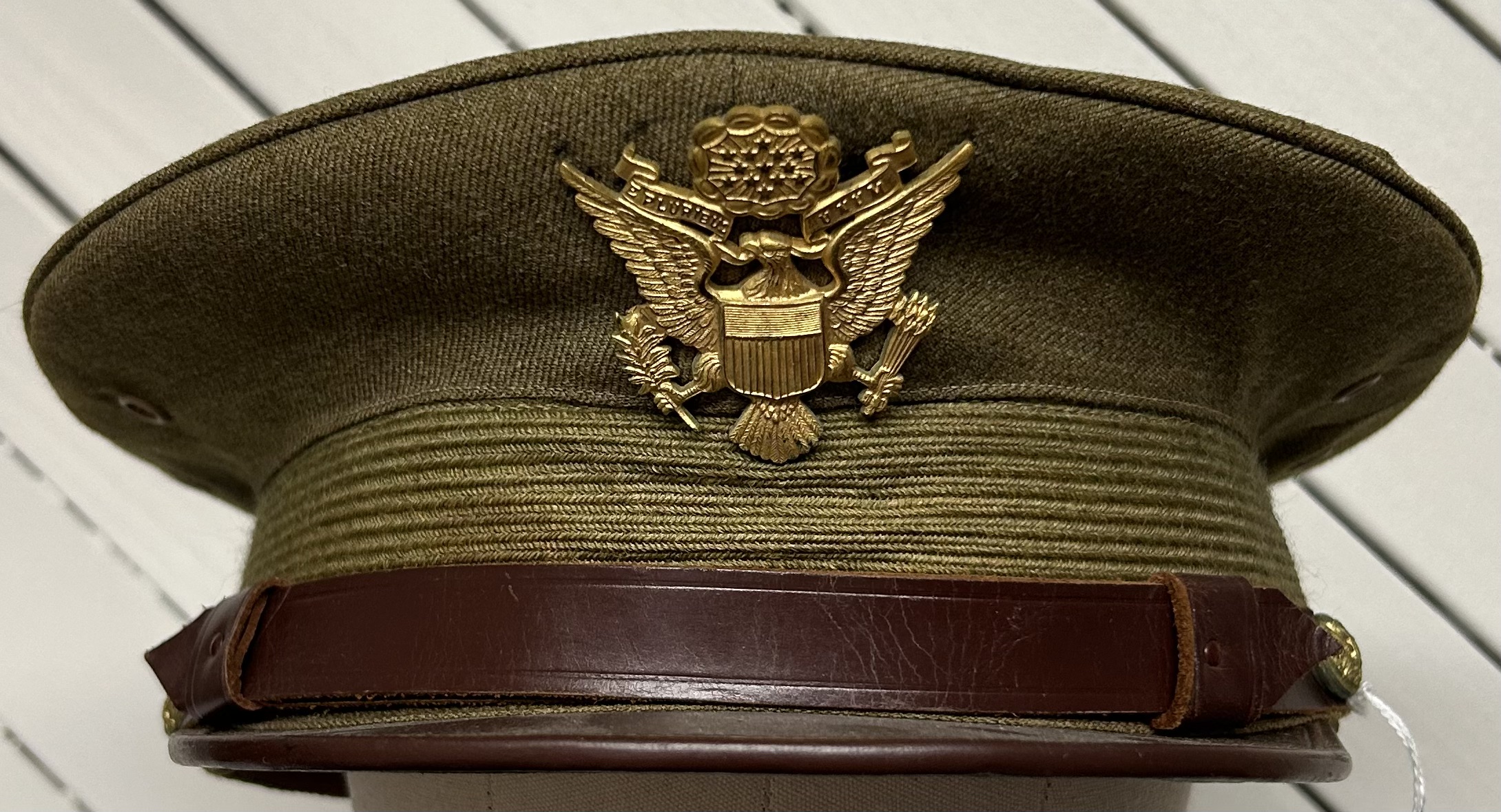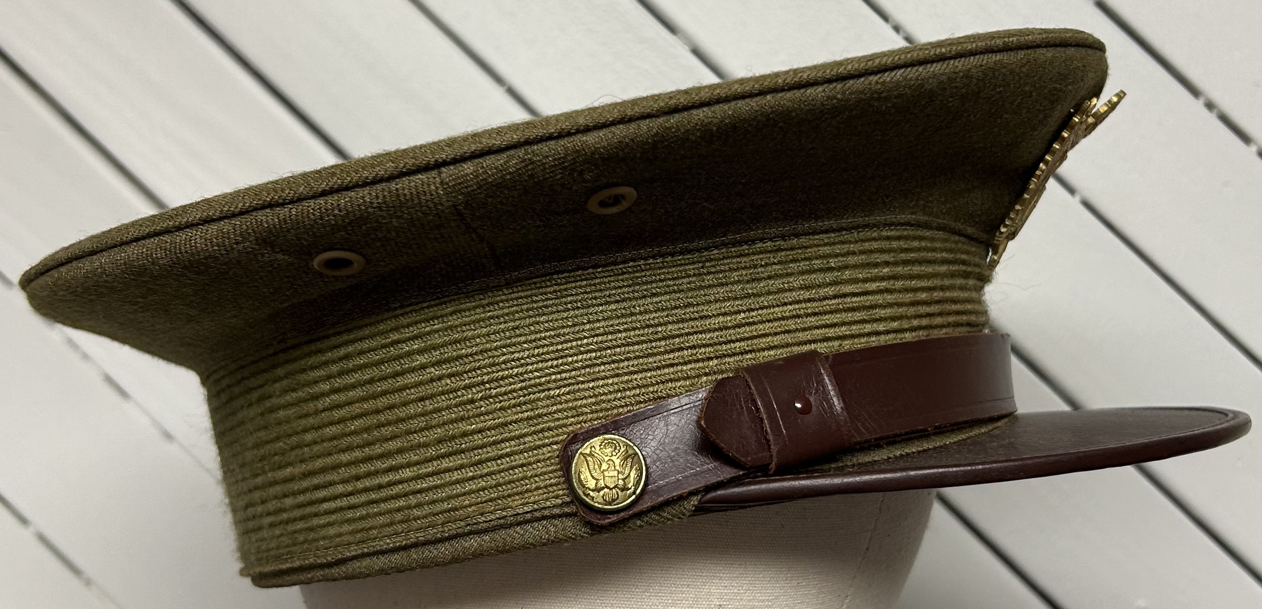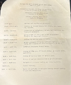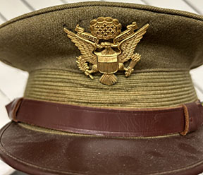 Pre-WWII US March Field Army Air Corps Officer Visor Cap. Cap is a size 7 3/8. The cap most likely belonged to an Army Air Corps officer at March Air Field, with the Ordance Day program being found folded and tucked within the cap. The cap is in near-mint condition with little to no damage to the interior or exterior. All leather is soft and wearable. Excellent cap badge as well. An overall nice and interesting piece.