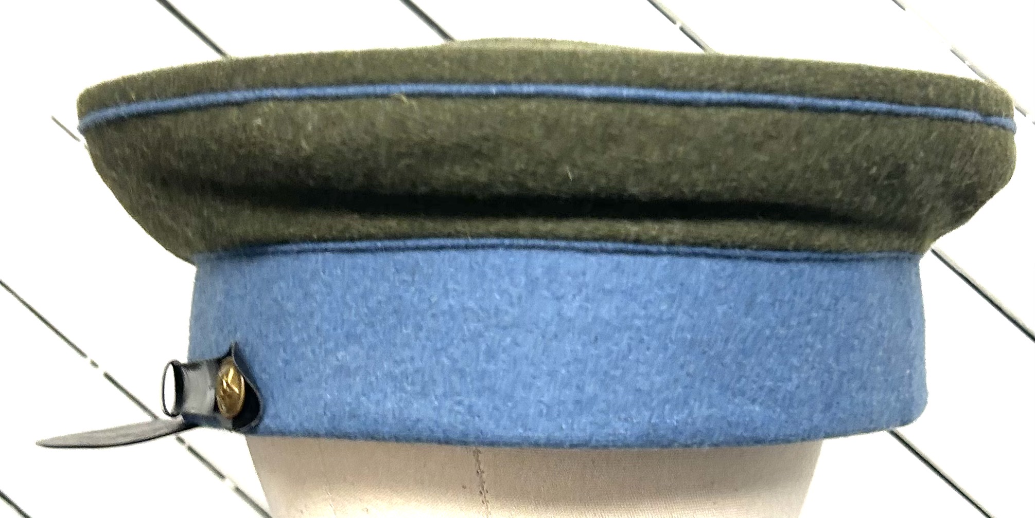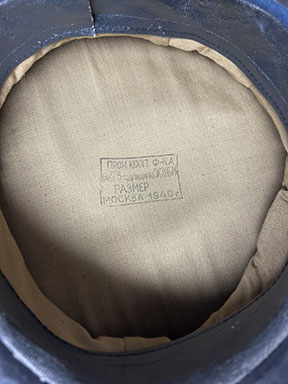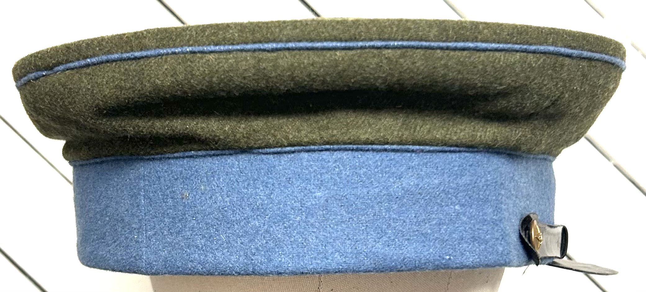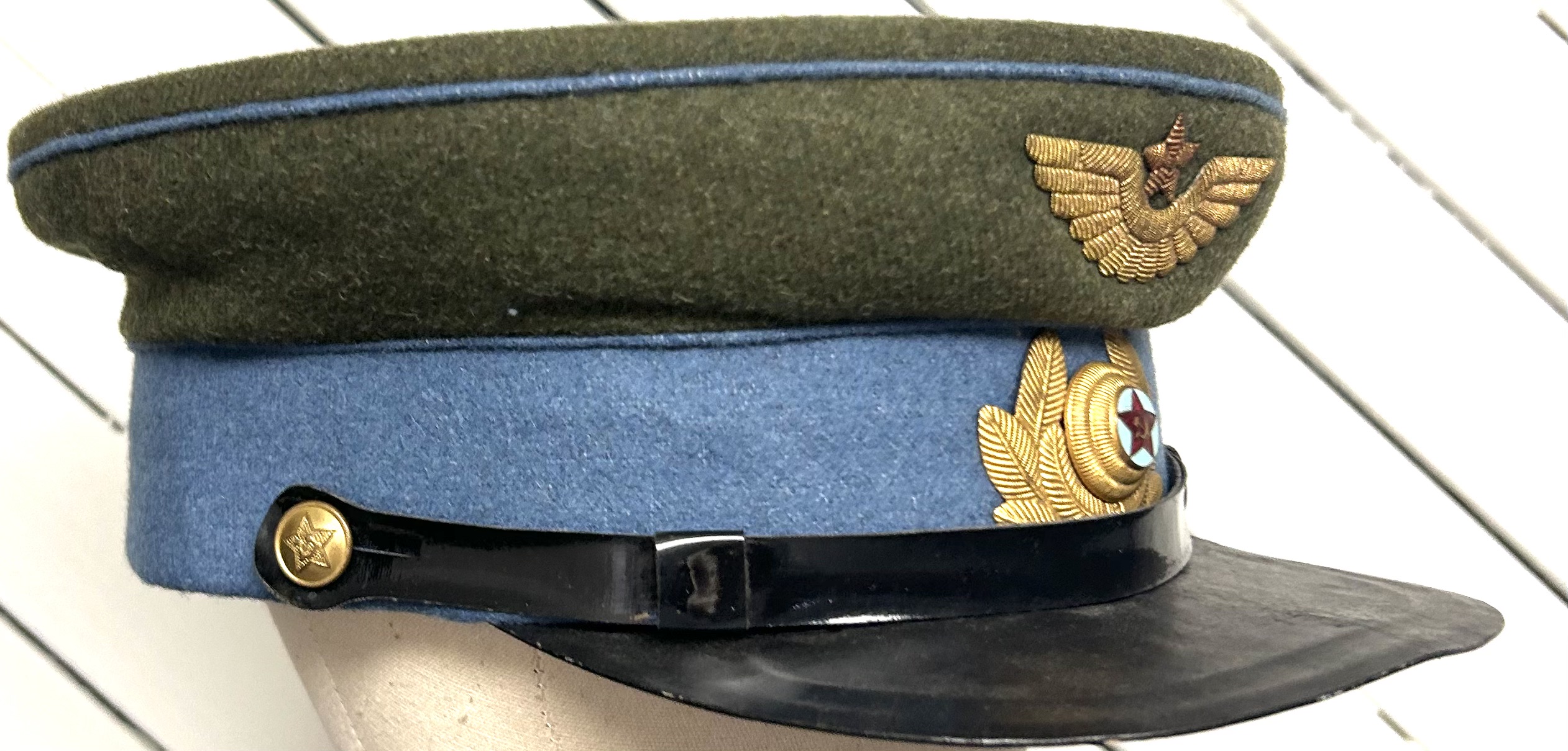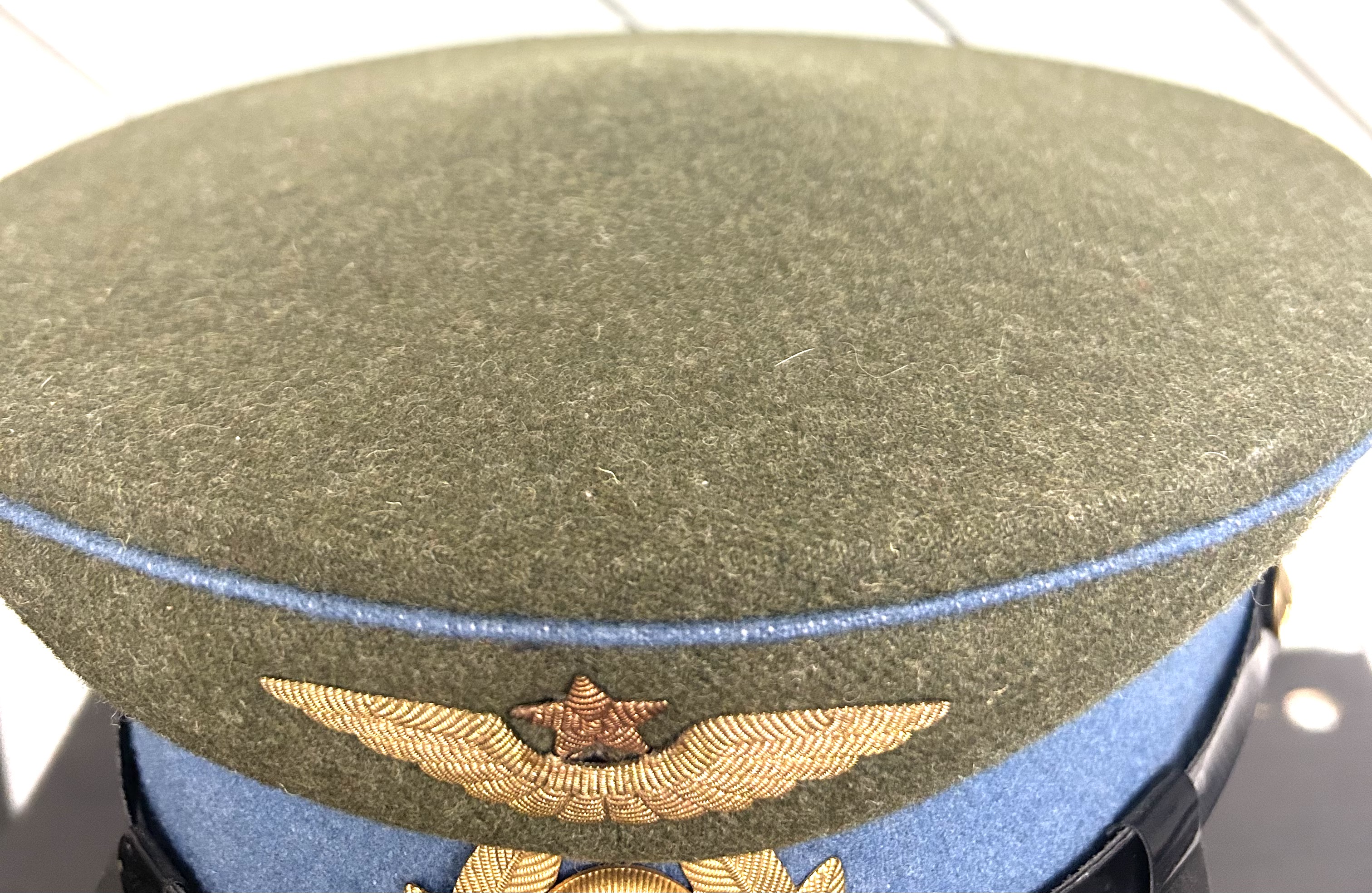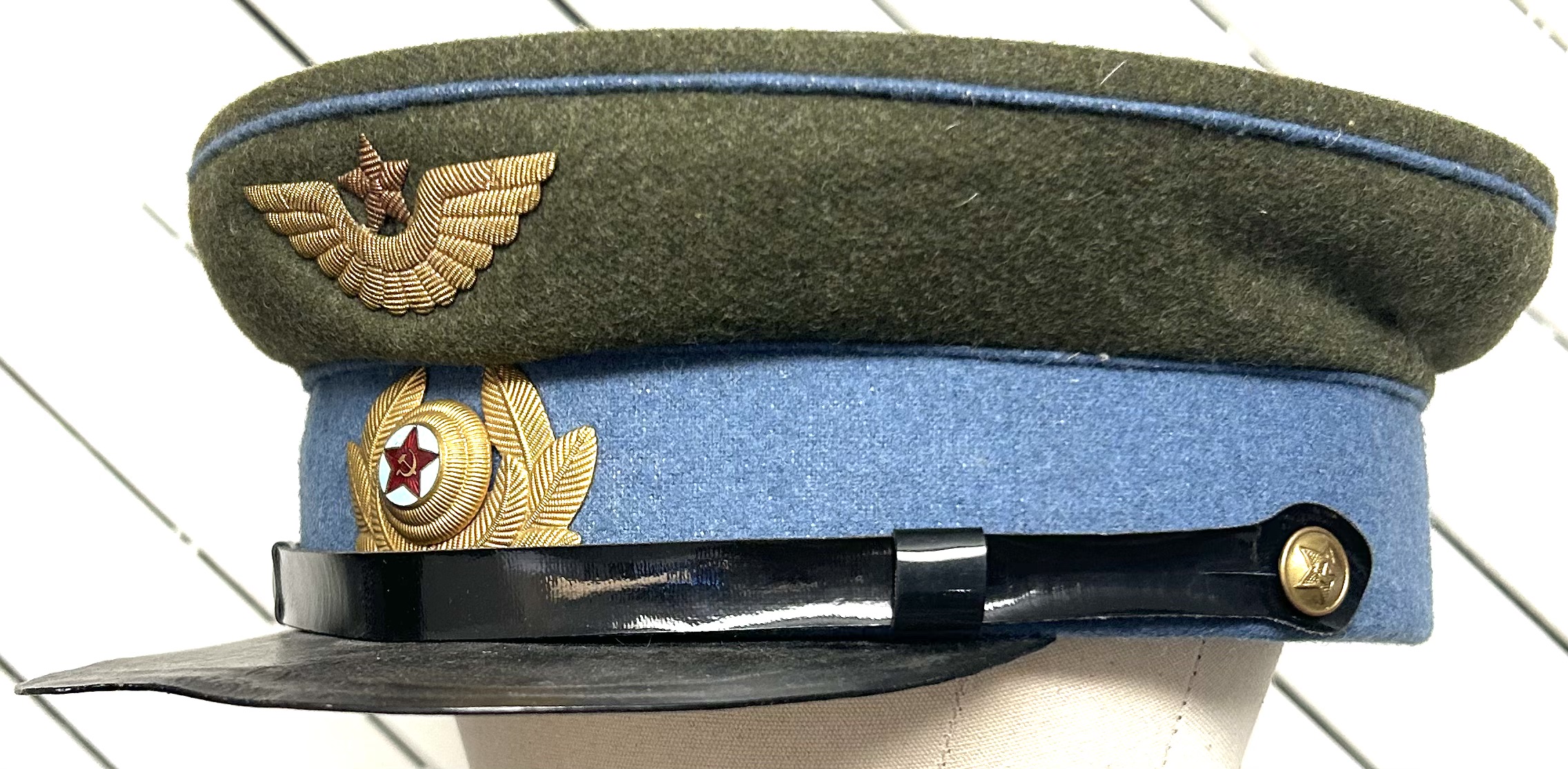 WWII Soviet Russian Aviation Officers Visor Cap. The cap has a nice, bright blue piping indicating the aviation branch. The cap is a size 60 and is dated 1940. Nice wool construction showing little wear and use. Nice metal insignia with enameled detailing. Nice rare cap in even better condition. Perfect for any collection.