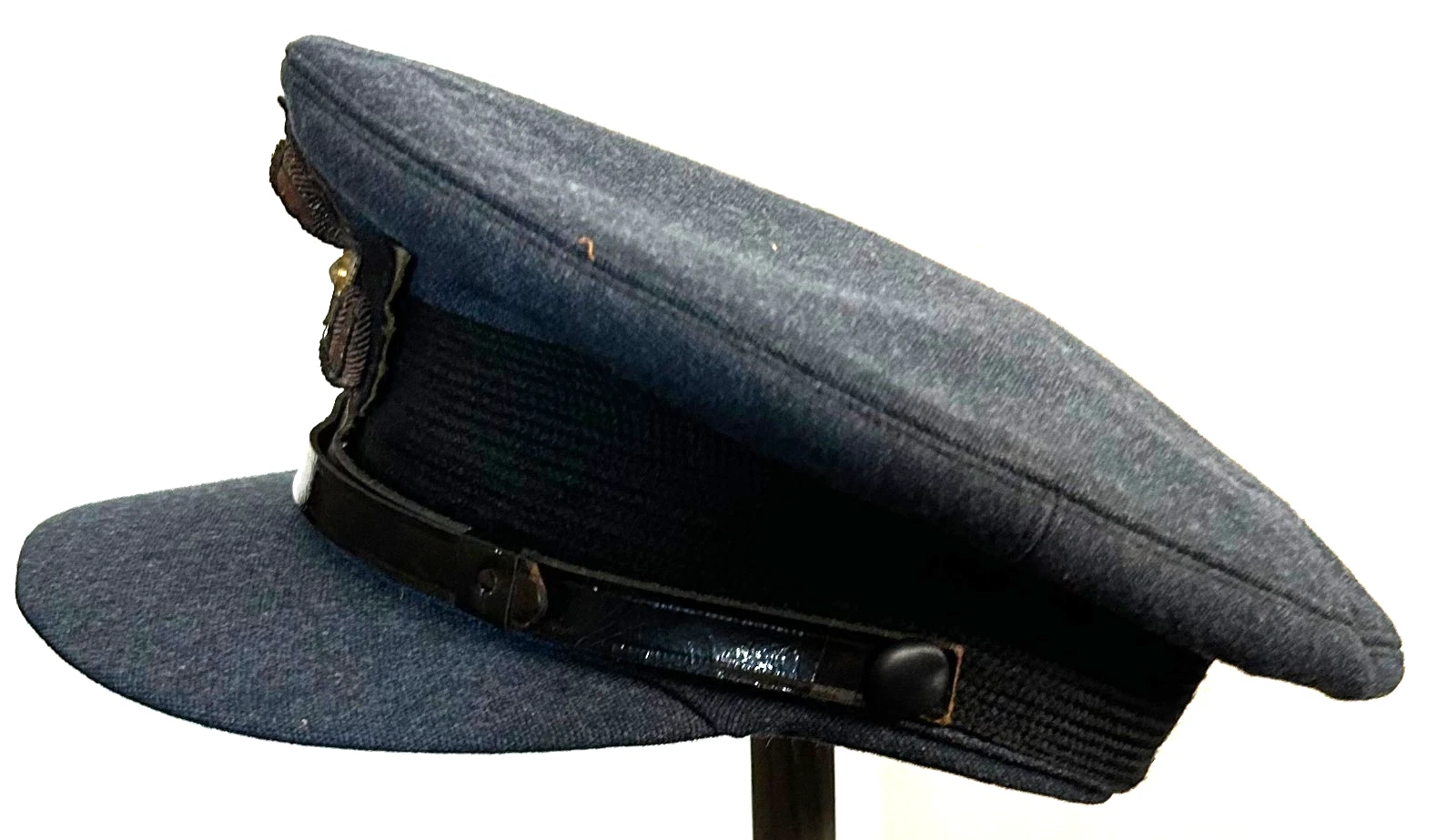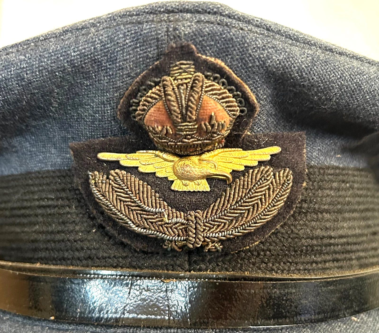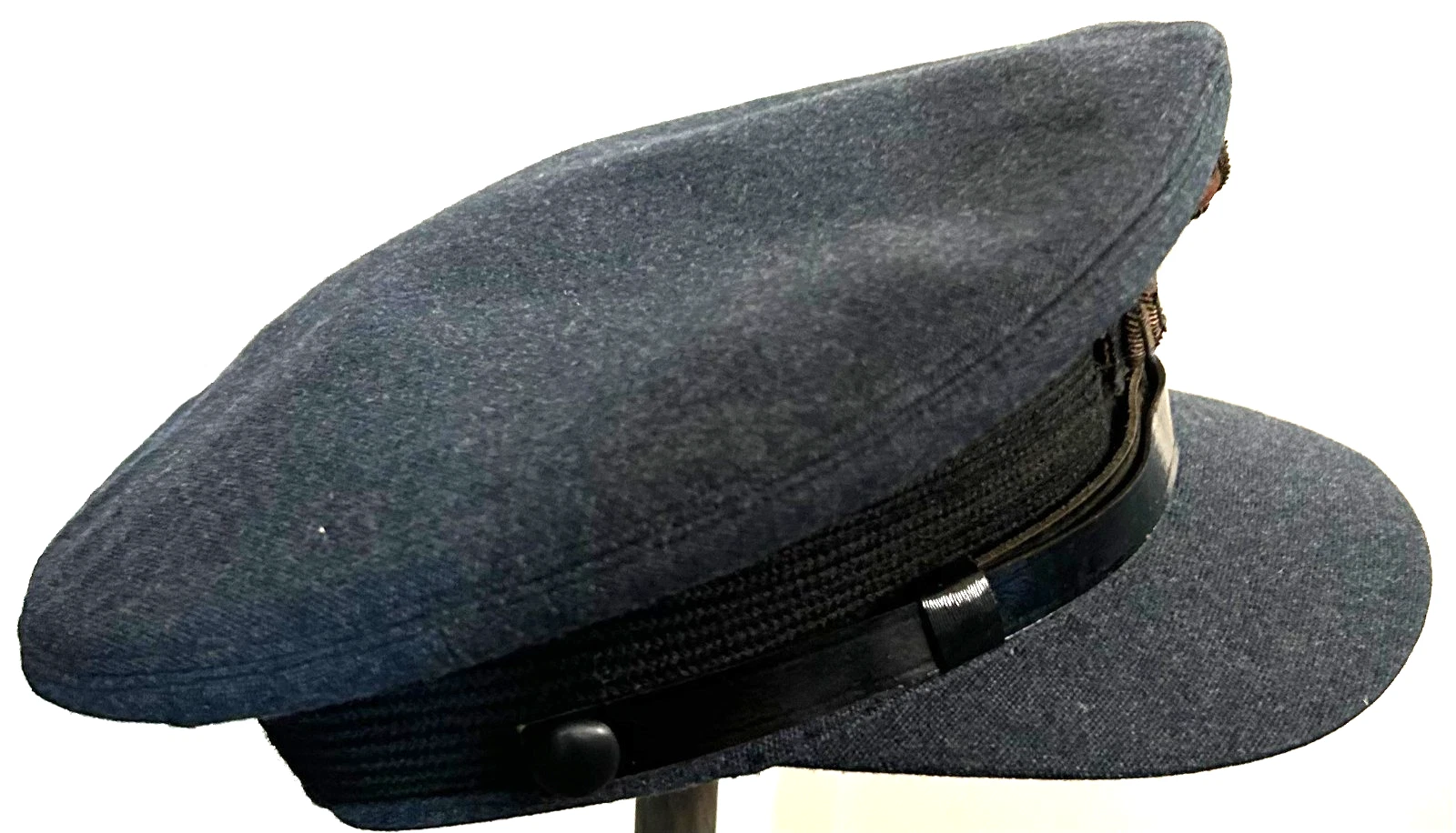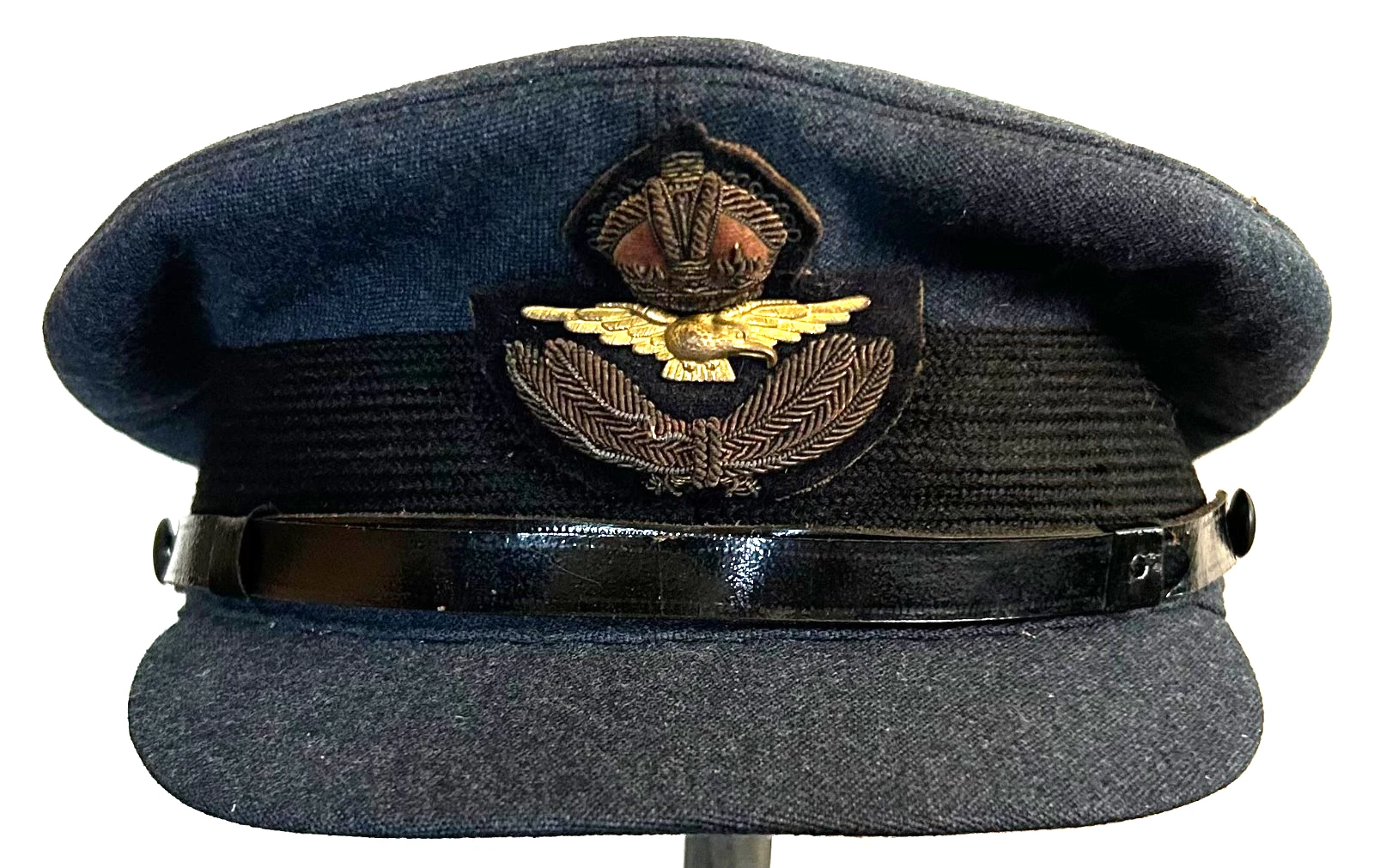 WWII British RAF Royal Air Force Officers Visor Cap. Cap is a size 6 7/8. Worn by British Officers in the RAF (Royal Air Force) during WWII. Exterior is in great shape with a nicely detailed bullion cap badge, along with very little wear being shown. Interiro is just the same, showing good age and a soft leather sweatband. Overall, a great cap in great condition.
