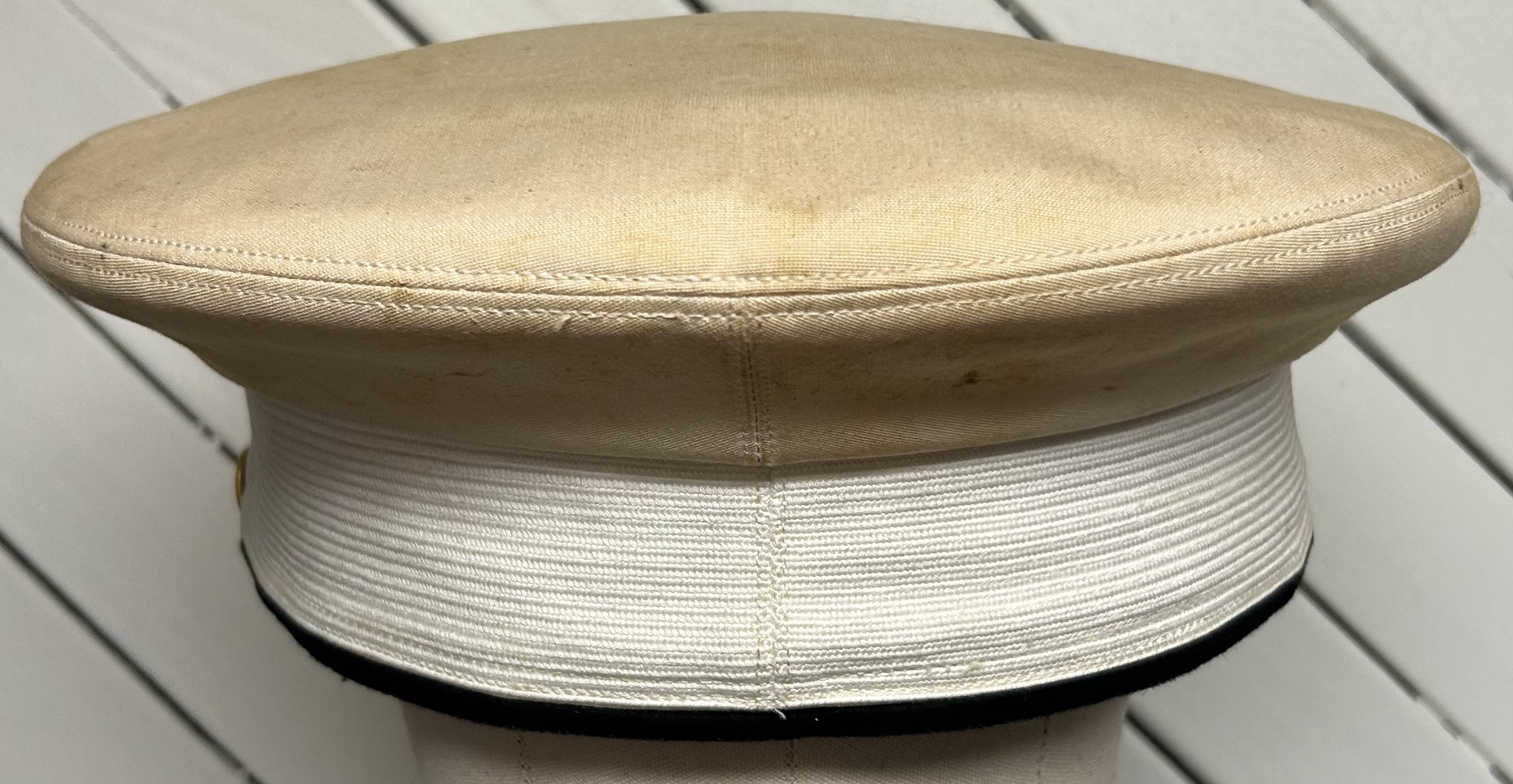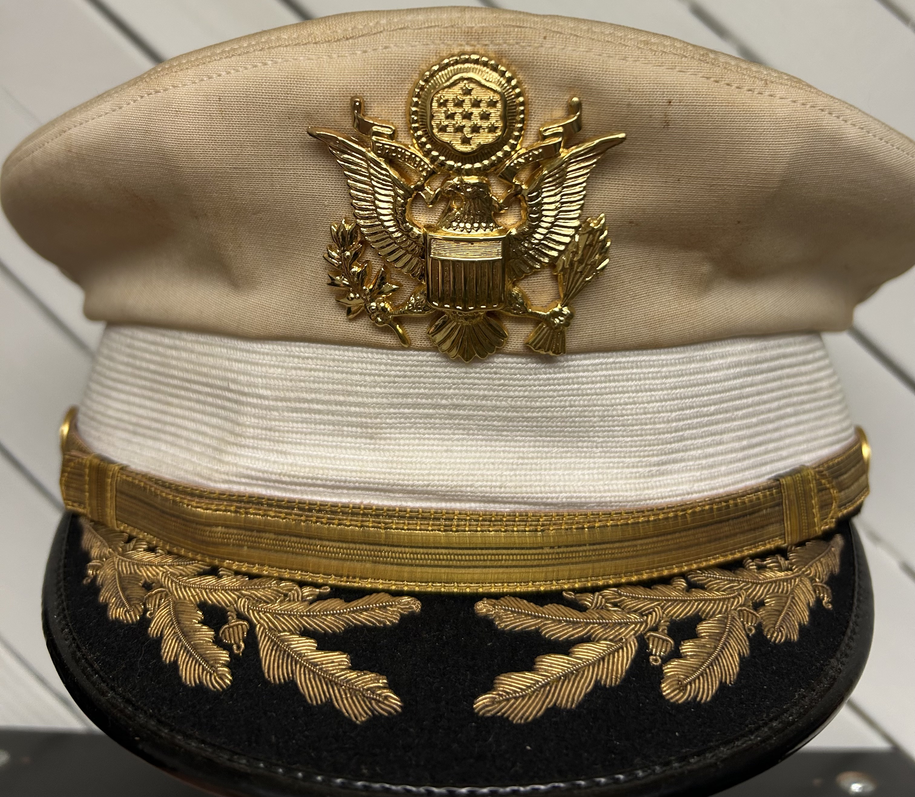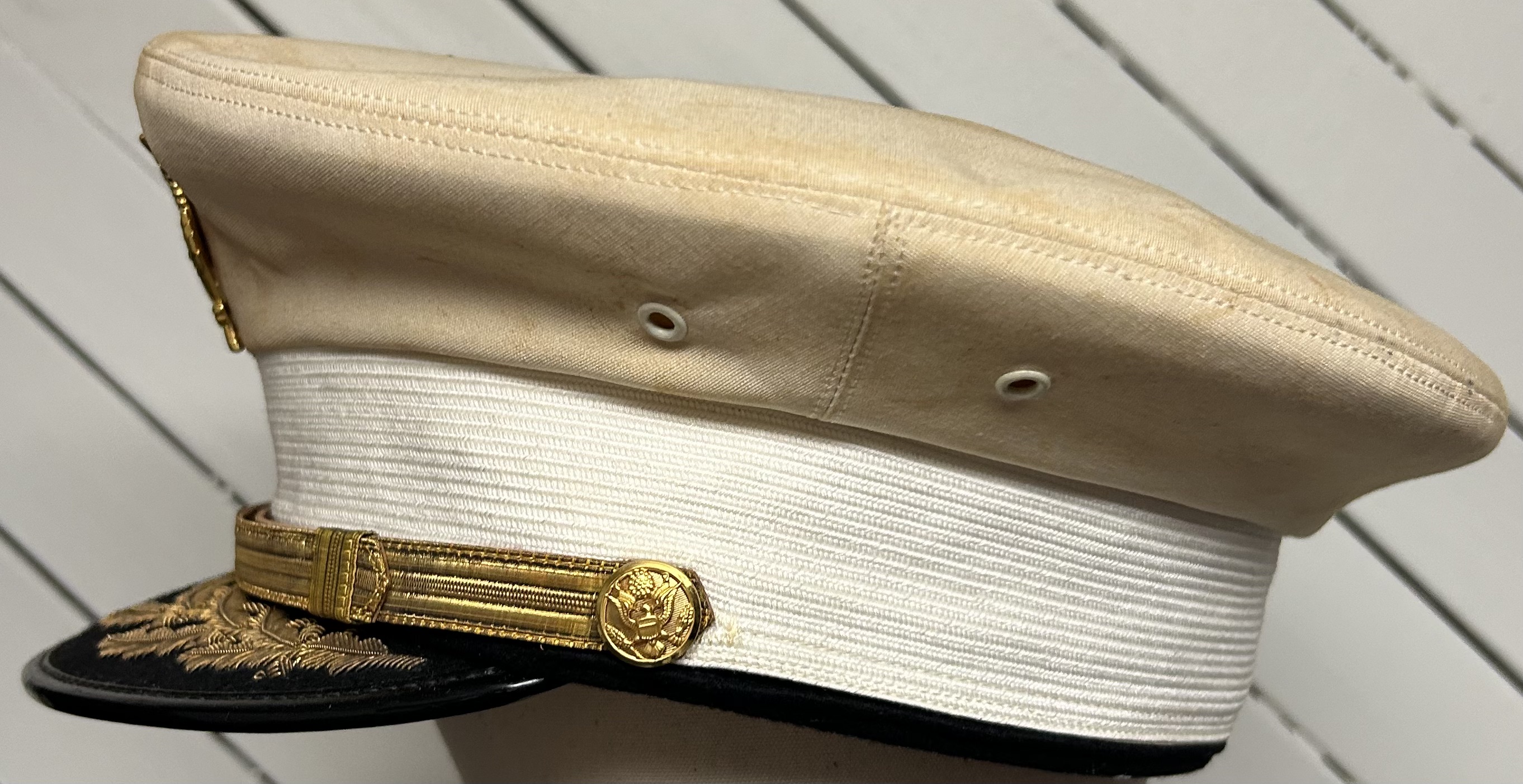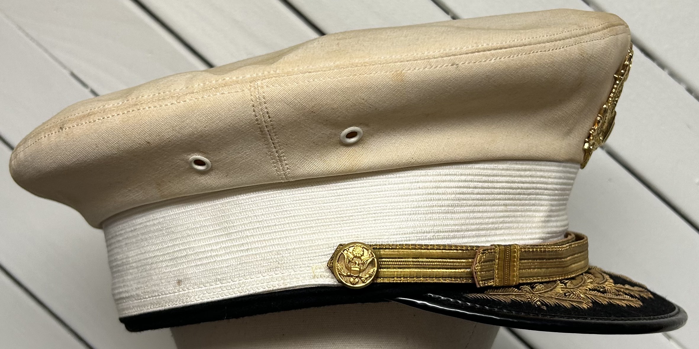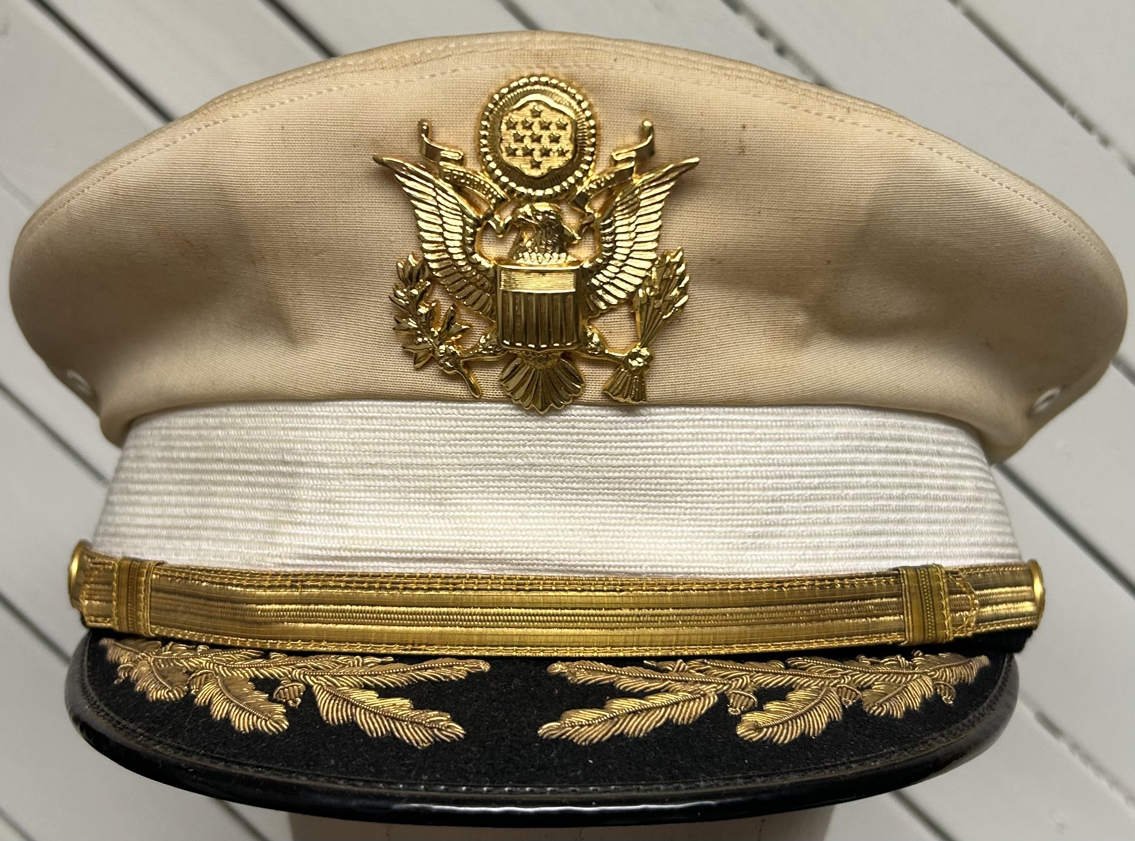WWII US Army Officers' Dress White Visor Cap. Size is 7 3/8. Nice Field Grade bullion detailing and cap badge. Strong and undamaged wicker frame and sweatband. Overall, a great cap for any collection.